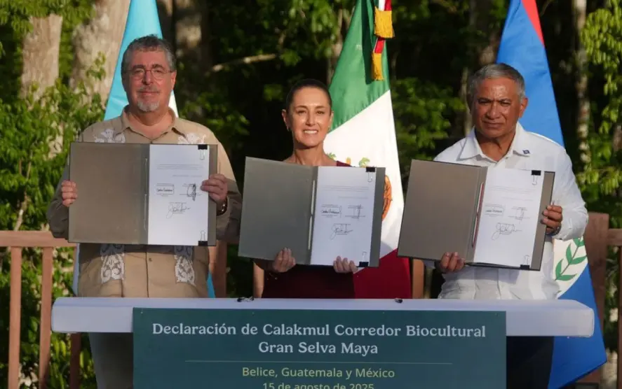 En Calakmul, la presidenta Sheinbaum, el primer ministro Briceño y el mandatario Arévalo firmaron este acuerdo trilateral para preservar 5.7 millones de hectáreas del corazón de Mesoamérica.
