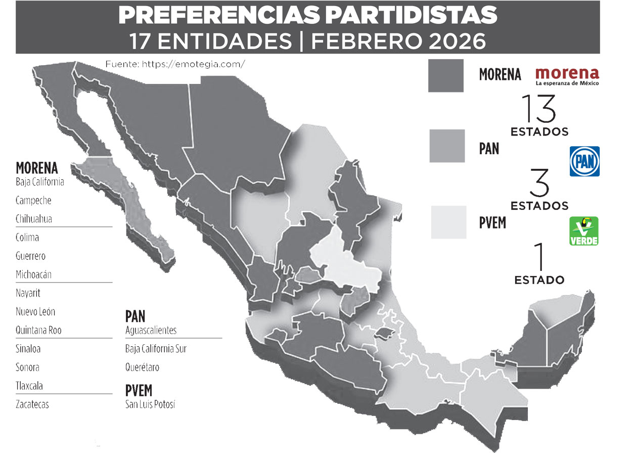 De acuerdo a Emotegia, el escenario electoral por entidad en careos por perfiles de mayor preferencia de partidos políticos, Morena va con 8 estados; el PAN con 6; mientras el PVEM, PRI y los del Sombrero estarían con un estados.