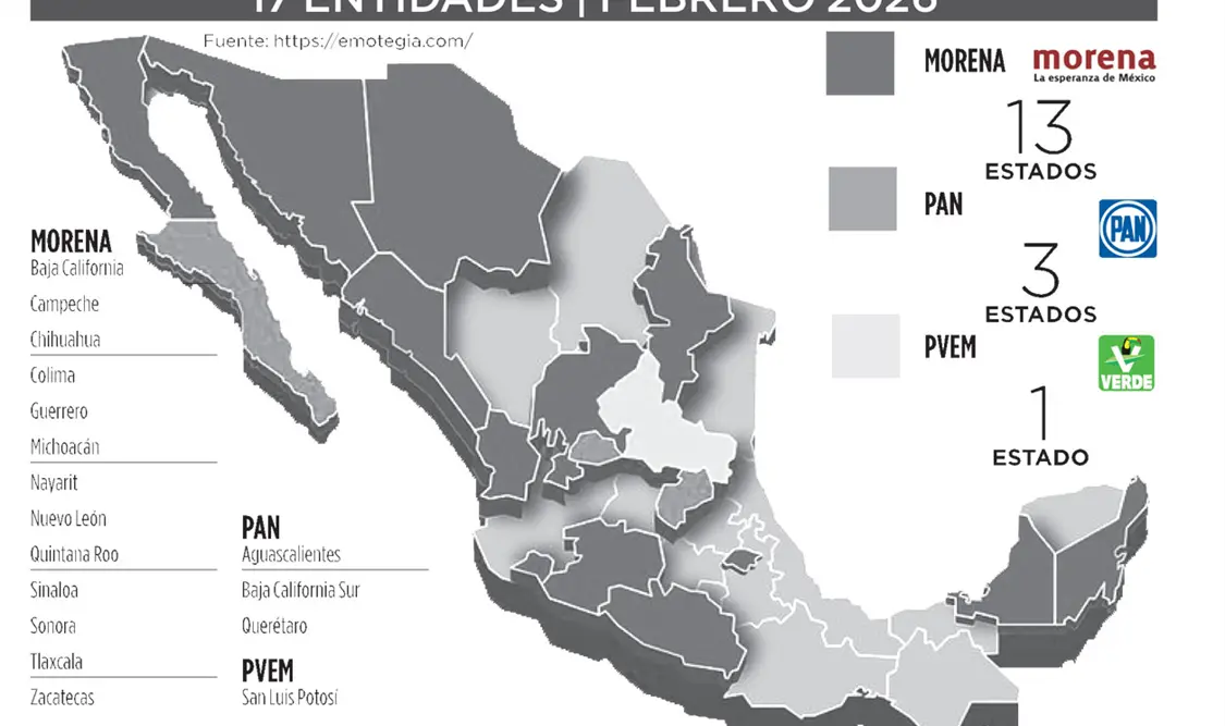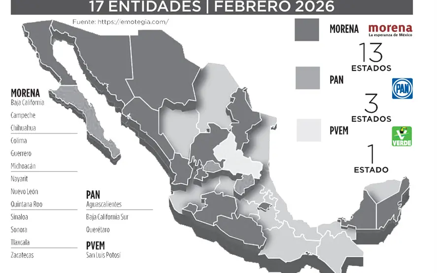 En 13 estados de los 17 que se elegirá gobernador en el 2027 estaría ganando Morena, de acuerdo a la encuestadora Emotegia, quien llevó a cabo un estudio cuantitativo, descriptivo y transversal realizado mediante encuesta digital autoaplicable.