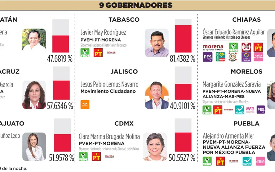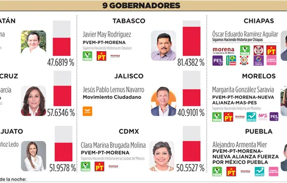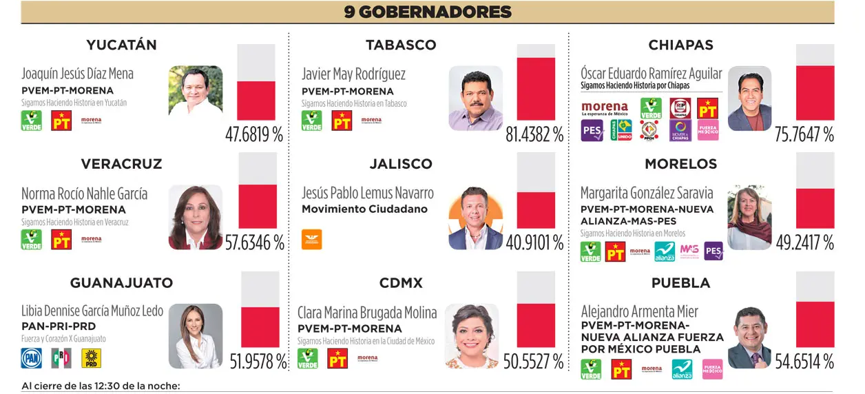 Sin grandes cambios, la elección en los ocho estados en disputa (sin contar a la Ciudad de México), tanto Morena como la alianza PRI-PAN-PRD (principalmente los panistas) y Movimiento Ciudadano (MC) mantuvieron sus estados.
