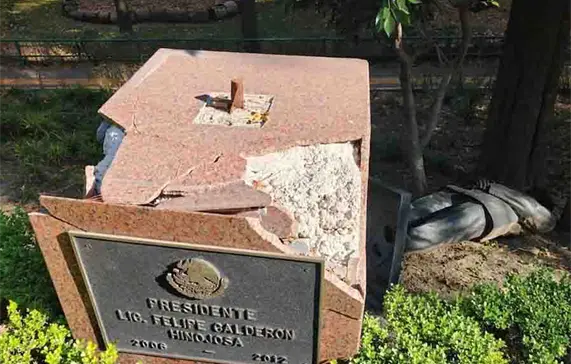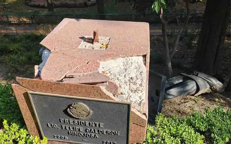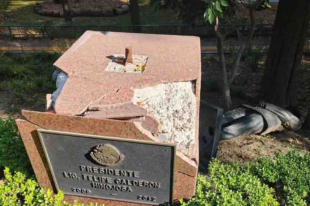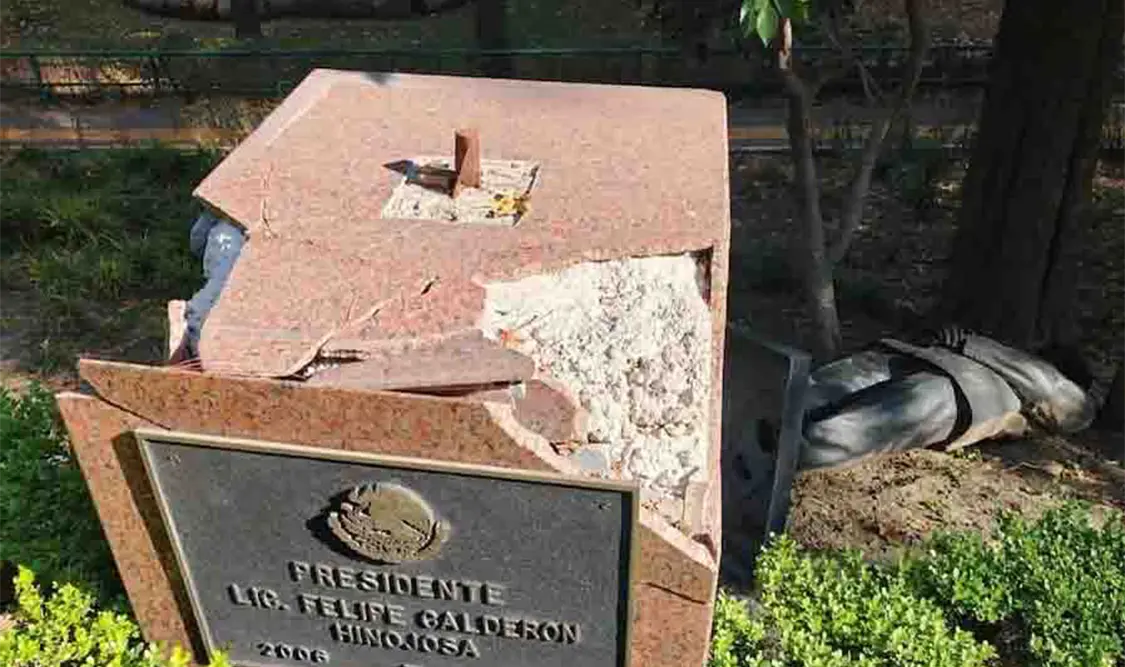 A cuatro meses de haber sido derribada por un árbol, la estatua del expresidente Felipe Calderón Hinojosa no ha sido colocada en la Calzada de los Presidentes, del Complejo Cultural Los Pinos. Se observa la base dañada que sostenía la figura y la placa con su nombre, mientras que la estatua está en el suelo entre lodo, hojas secas y tierra. “Mira nada más” y “¡Se cayó la de Calderón!”, son algunas expresiones de visitantes.