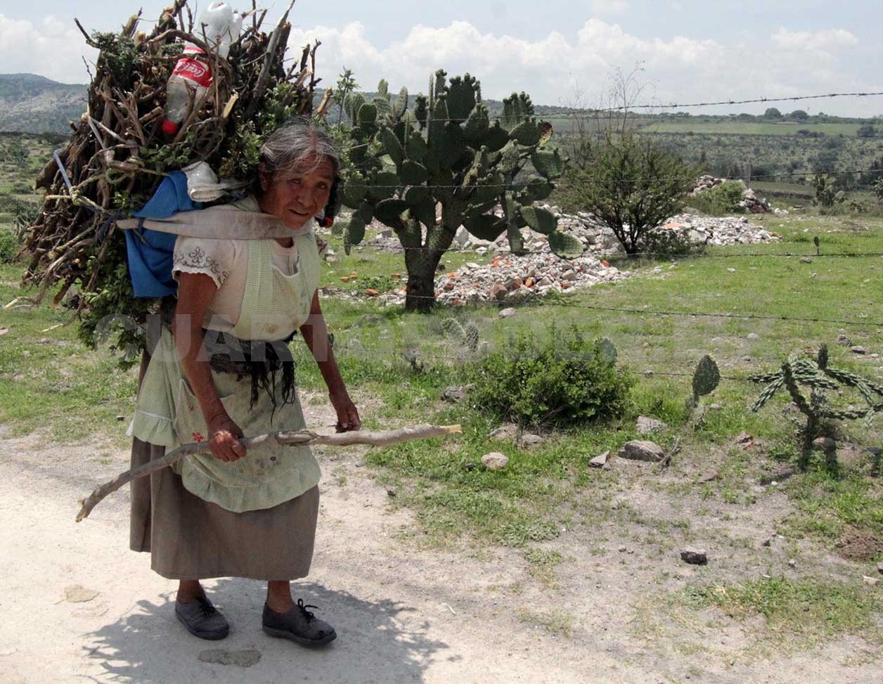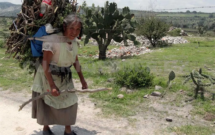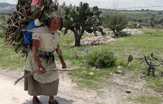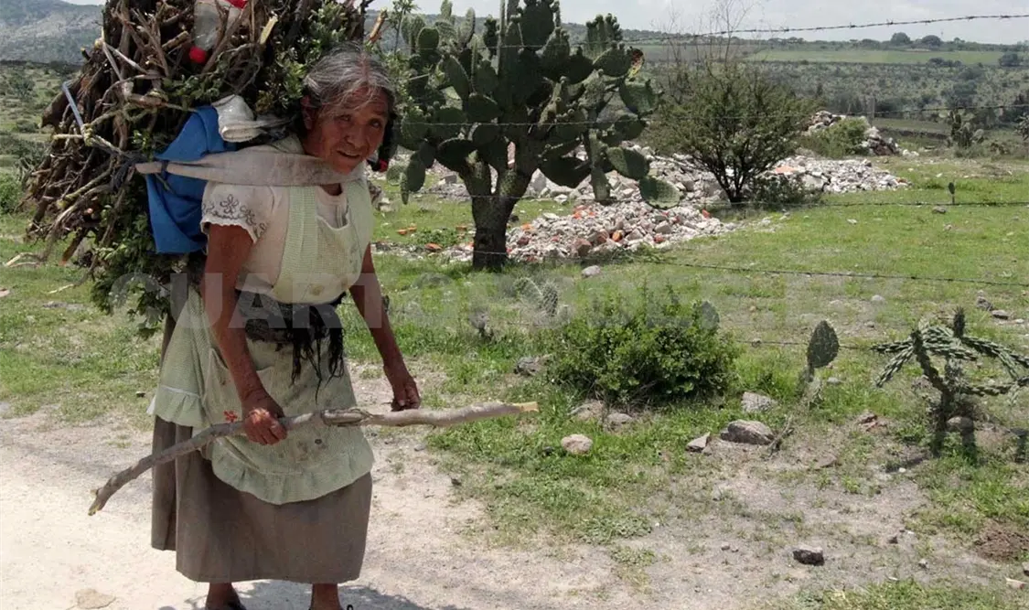 Una mujer otomí perteneciente a la comunidad del Valle del Mezquital, en el estado de Hidalgo, realiza un recorrido sobre montañas y vegetación para llegar su casa mientras carga madera.