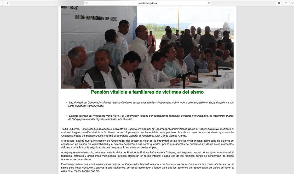 Agregó que este mismo día, en el marco de la visita del Presidente Enrique Peña Nieto a Chiapas, se integraron grupos de trabajo con funcionarios federales, estatales y presidentes municipales, quienes atenderán en forma integral a cada una de las regiones donde se concentran los daños ocasionados por el sismo.