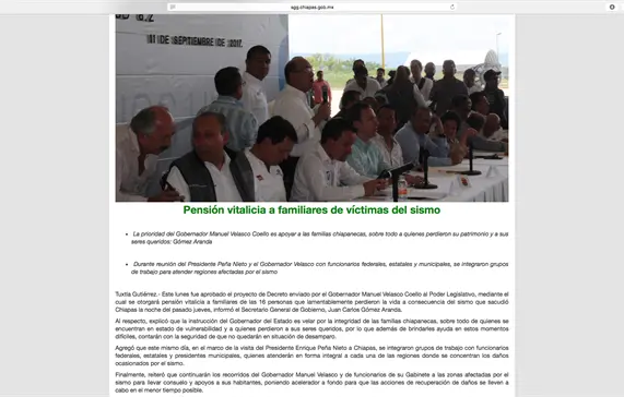 Finalmente, reiteró que continuarán los recorridos del Gobernador Manuel Velasco y de funcionarios de su Gabinete a las zonas afectadas por el sismo para llevar consuelo y apoyos a sus habitantes, poniendo acelerador a fondo para que las acciones de recuperación de daños se lleven a cabo en el menor tiempo posible.
