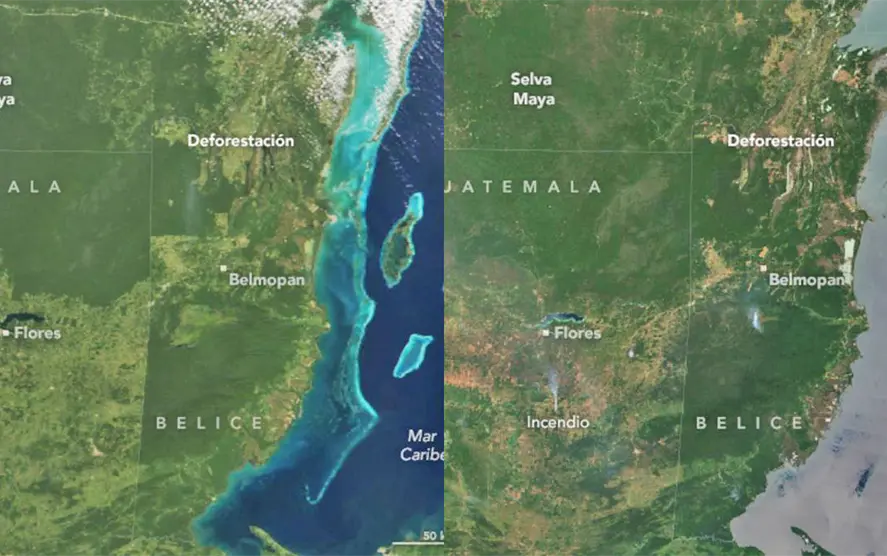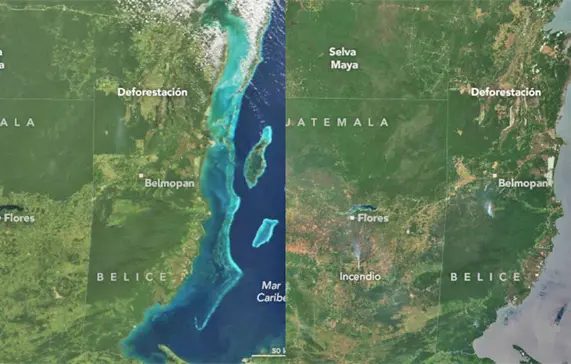 Las imágenes muestran un cambio radical en los paisajes que comprenden a la Selva Maya, la cual se despliega a lo largo del sur de México, colindando con Chiapas, Quintana Roo, Campeche y parte del territorio de Tabasco, también es parte de Belice y el norte de Guatemala.