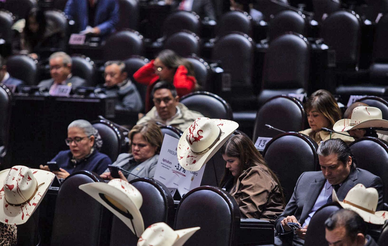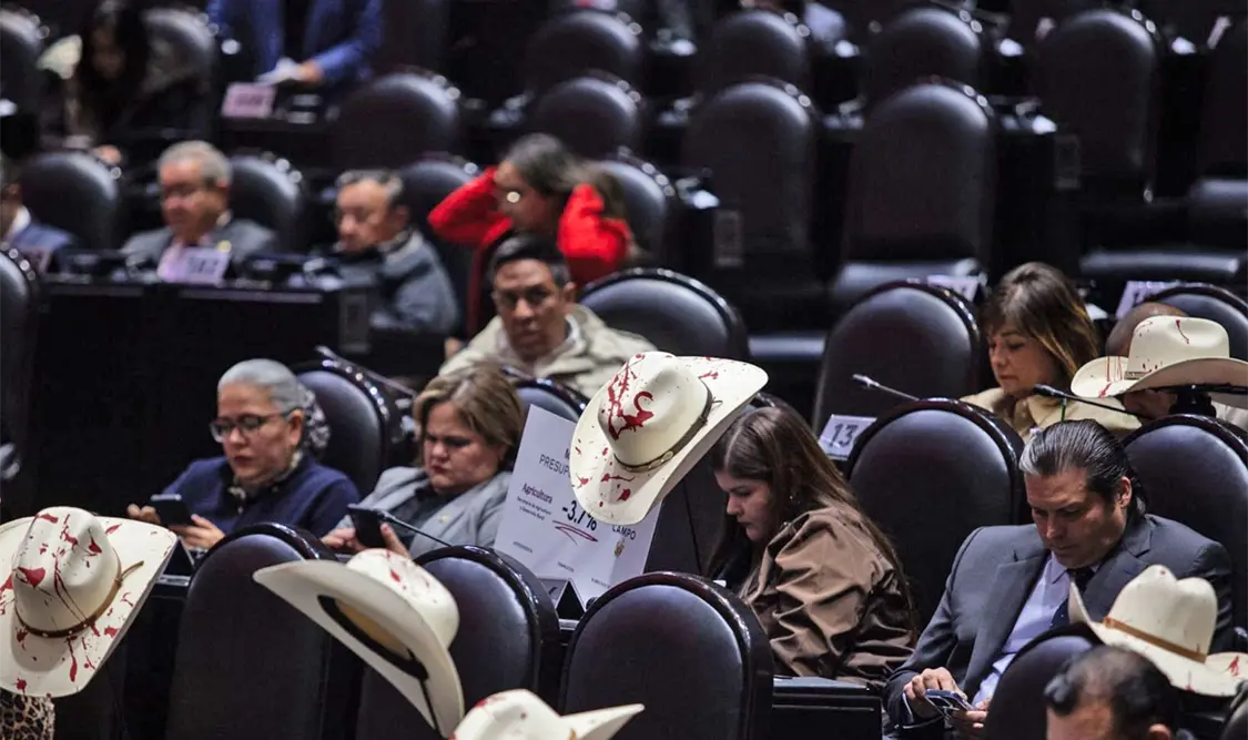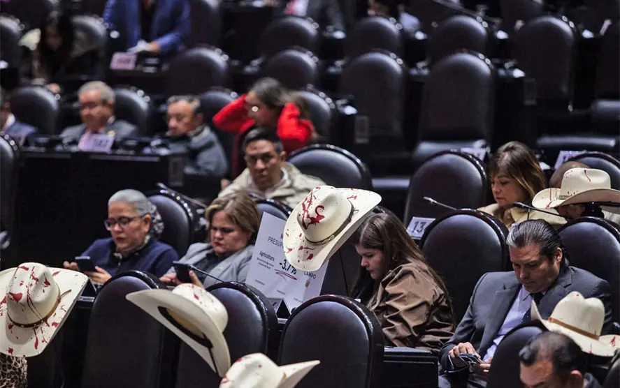 Previo a la sesión ordinaria de ayer martes, en la Cámara de Diputados, las bancadas del PAN y del PRI colocaron sombreros en sus curules, con pintura roja, aparentando sangre, y veladoras de plástico en memoria de Carlos Manzo.
