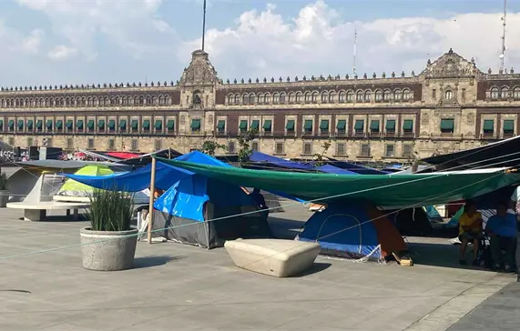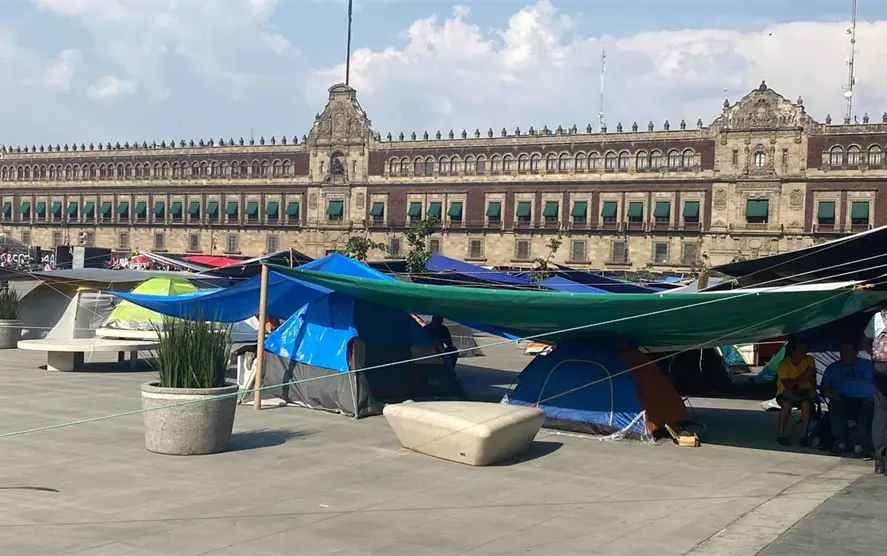 Pese a que los maestros prometieron a reubicar su plantón previo a la manifestación de la Marea Rosa, en el primer cuadro del Centro Histórico permanecen decenas de casas de campaña, toldos, lonas y colchonetas en donde los trabajadores de la educación comen y duermen.