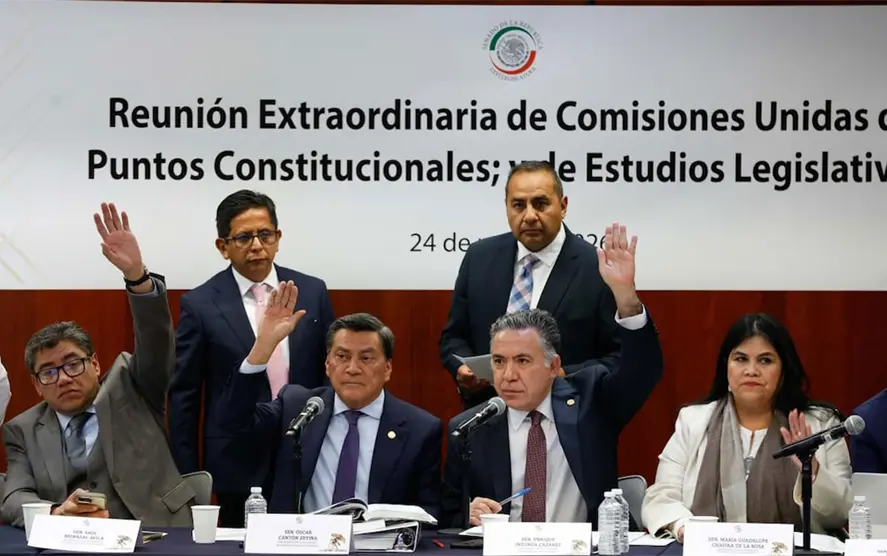 Con los votos de Movimiento de Regeneración Nacional (Morena) y el Partido Verde Ecologista de México (PVEM), las comisiones unidas de Puntos Constitucionales y Estudios Legislativos del Senado aprobaron el dictamen del Plan B en materia electoral, en una sesión en la que se ausentaron los legisladores del Partido del Trabajo (PT), cuya bancada mantiene su rechazo a que la consulta de revocación de mandato se realice el mismo día de la elección federal intermedia de 2027 y que la presidenta haga campaña.