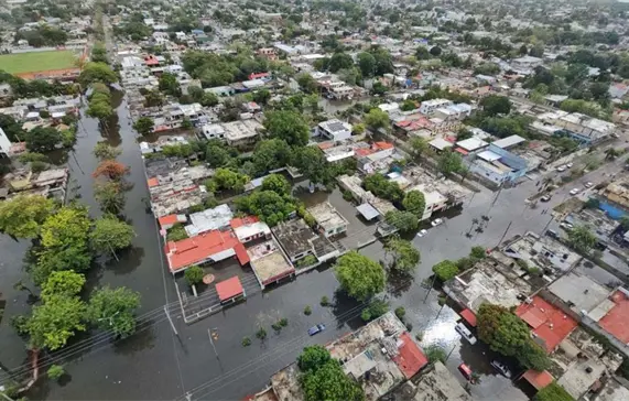 Ante las inundaciones en Chetumal, Quintana Roo, la Secretaría de Marina aplica el Plan Marina con el apoyo de vehículos todo terreno tipo Unimog y vehículos tipo Comando.