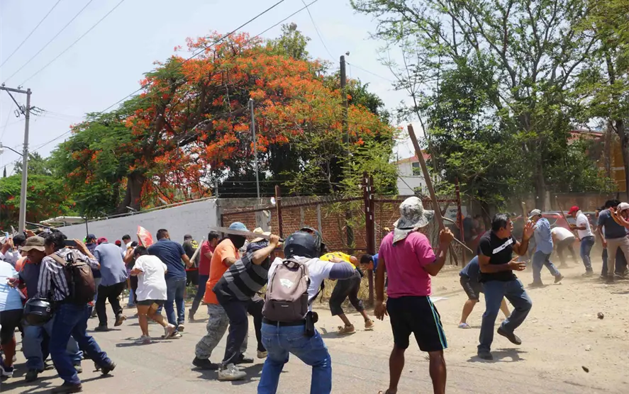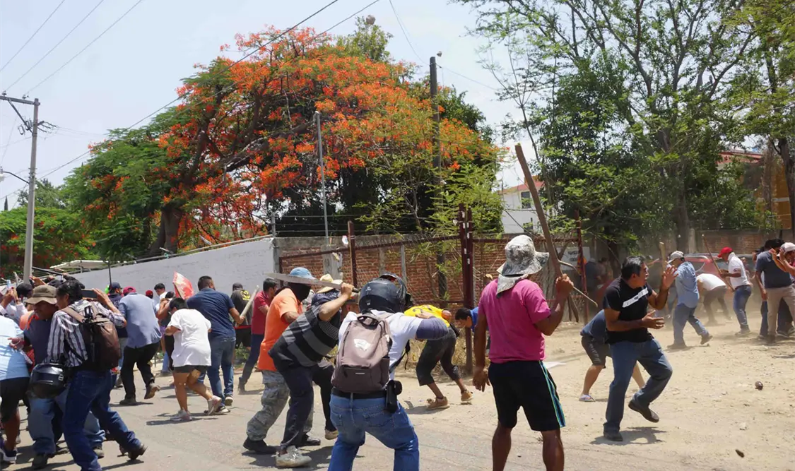 A tres horas de iniciado un bloqueo a los accesos del Aeropuerto Internacional “Benito Juárez” de Oaxaca, por parte de maestros integrantes de la Sección 22 del Sindicato Nacional de Trabajadores de la Educación (SNTE), que ha dejado a cientos de pasajeros varados y al menos 31 vuelos suspendidos, decenas de pobladores de comunidades, como La Raya, perteneciente al municipio Zimatlán de Álvarez, plantaron cara a los docentes armados con palos y machetes.