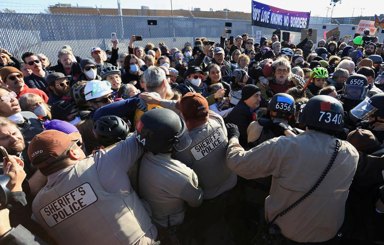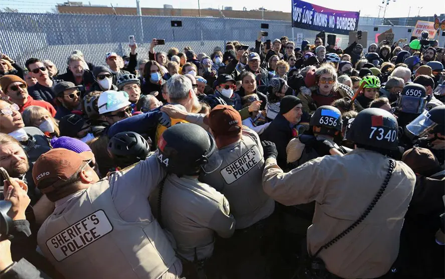 Momentos antes del enfrentamiento, los manifestantes cantaban y coreaban consignas. Alrededor de las 10 de la mañana, un numeroso grupo de personas, sabiendo que serían arrestadas, presuntamente cruzó la barrera de protesta e intentó acercarse a la instalación del Servicio de Inmigración y Control de Aduanas de Estados Unidos (ICE, por sus siglas en inglés).