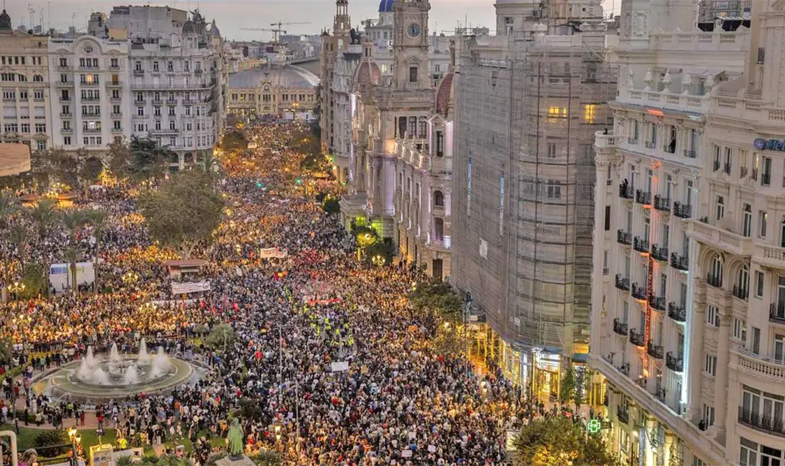 La plaza del Ayuntamiento de Valencia se llenó de gente, que en algunos casos ha llegado en columnas que han partido de varios barrios de la ciudad y de municipios vecinos, entre ellos algunos de las más afectadas.