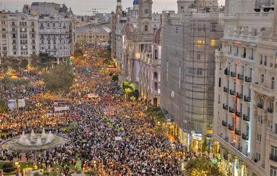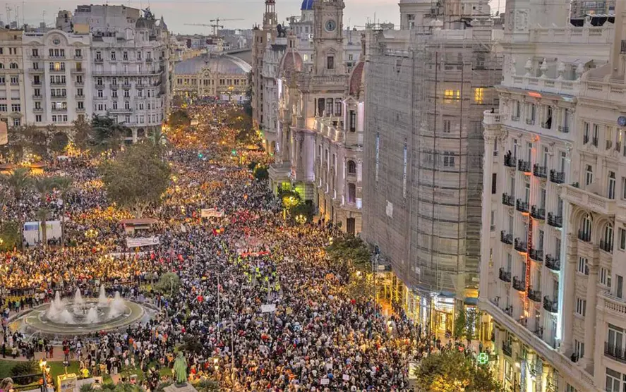 Una multitudinaria manifestación convocada por organizaciones sociales, cívicas y sindicatos de izquierda de la Comunitat Valenciana en protesta por la gestión de la dana y con el lema ‘Mazón dimisión’, en alusión al presidente de la Generalitat, Carlos Mazón, se lleva a cabo en la plaza del Ayuntamiento de Valencia.