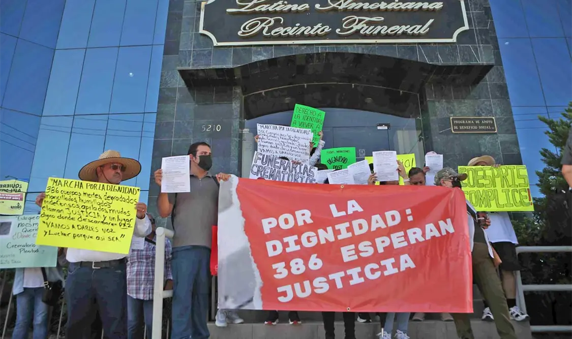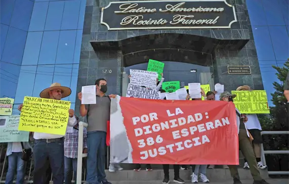 La concentración inició en la funeraria Latinoamericana donde los familiares pidieron justicia por sus difuntos, además de solicitar la intervención de la Fiscalía General de la República (FGR) al no confiar en las autoridades de la Fiscalía General del Estado (FGE) y de la Comisión Estatal para la Protección contra Riesgos Sanitarios (Coespris).