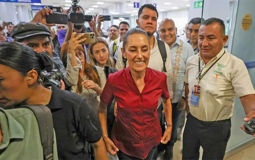 Con porras y abrazos, Claudia Sheinbaum, candidata a la Presidencia de México por la coalición Sigamos Haciendo Historia (Morena-PT-PVEM), llegó al Aeropuerto Internacional de Villahermosa, Tabasco, donde le dieron la bienvenida cientos de militantes y simpatizantes, entre los que se destacaron grupos de mujeres y jóvenes.