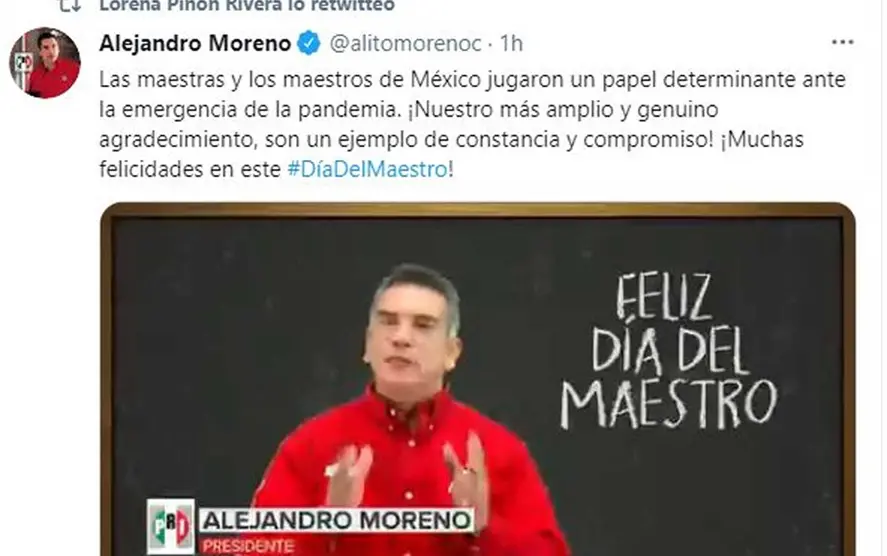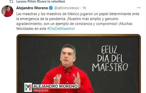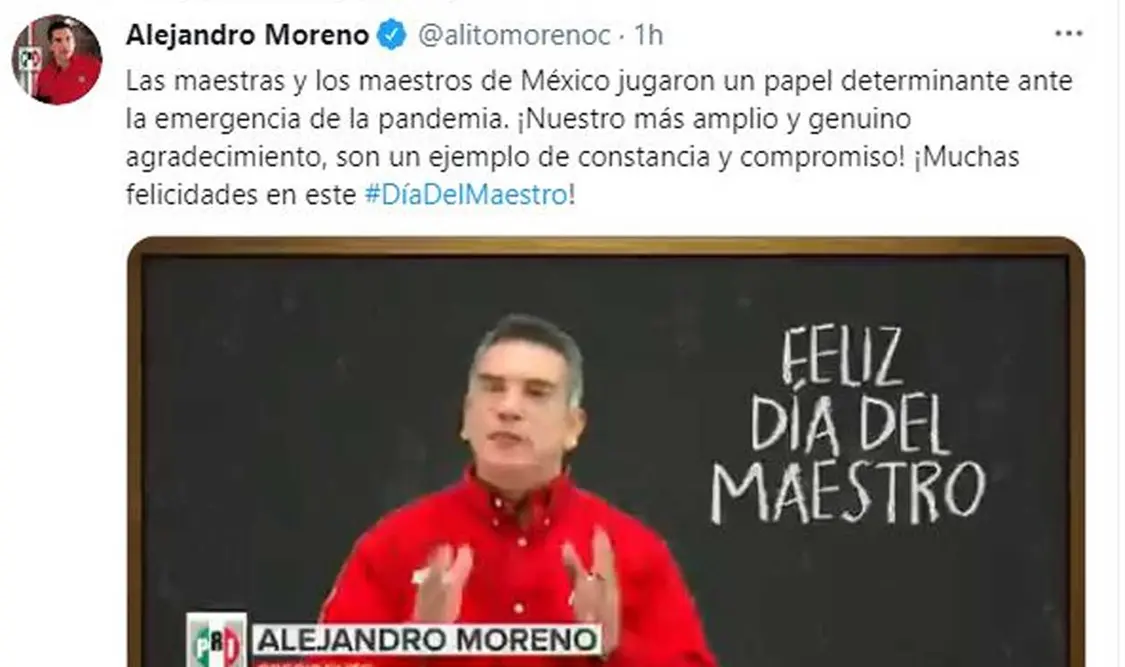 Alejandro Moreno, presidente del Comité Ejecutivo Nacional (CEN) del Partido Revolucionario Institucional (PRI), felicitó a las maestras y maestros de México en su día porque, afirmó, jugaron un papel determinante en el último año ante la emergencia de la pandemia.