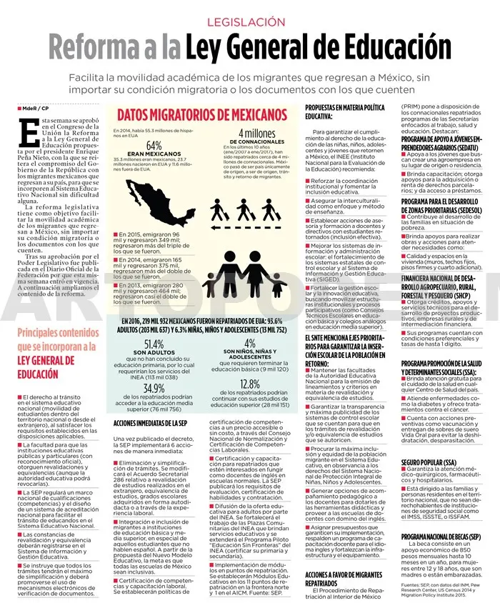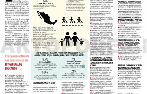 Esta semana se aprobó en el Congreso de la Unión la Reforma a la Ley General de Educación propuesta por el presidente Enrique Peña Nieto, con la que se reitera el compromiso del Gobierno de la República con los migrantes mexicanos que regresan a su país, para que se incorporen al Sistema Educativo Nacional sin dificultad alguna.
