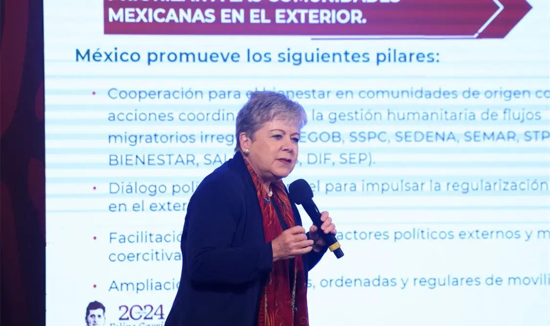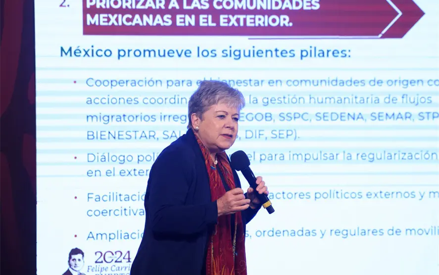 En la conferencia mañanera del presidente Andrés Manuel López Obrador, la canciller Bárcena señaló el “modelo único” para atender a dos grupos de personas: mexicanos en el exterior y personas extranjeras en México.