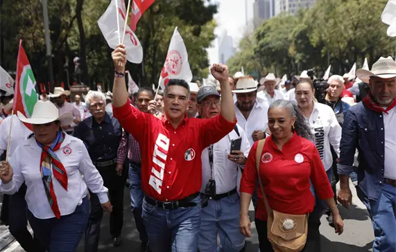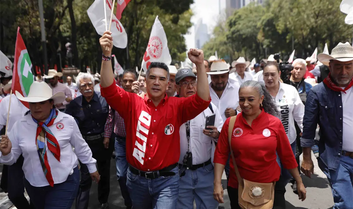 Entre banderines del PRI, lonas y la consigna de “Alito no estás solo” en apoyo al priísta, los militantes avanzaron sobre Paseo de la Reforma, con dirección a la Torre del Caballito, mientras lanzaban consignas como “No estás solo” y “Más presupuesto al campo”, “Alito el pueblo está contigo”, entre otras.