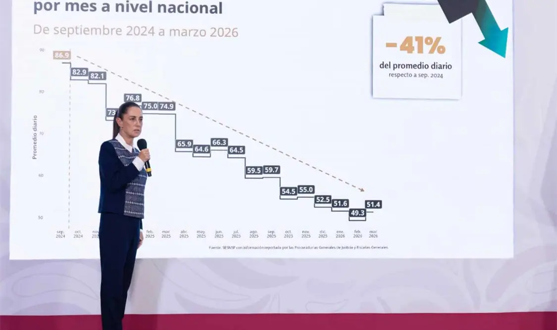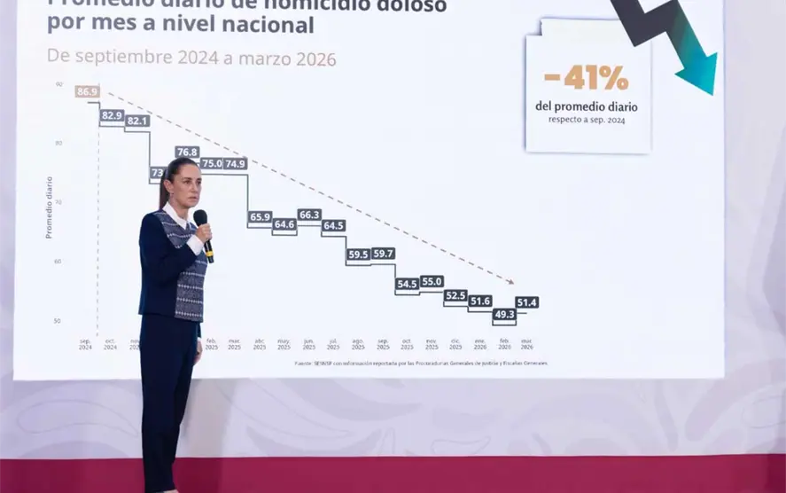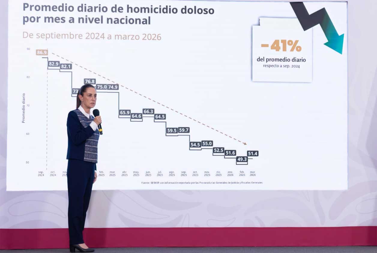 La presidenta Claudia Sheinbaum Pardo destacó que la Estrategia Nacional de Seguridad está dando resultados, ya que, de manera preliminar, los homicidios dolosos en el país presentan una reducción anual del 45 por ciento, al pasar de 91.7 en 2024 a 50.8 en el primer trimestre de 2026 y señaló que desde el Gobierno de México se continúa trabajando, por esta razón, anunció la creación de la Escuela para Mandos en la Academia Nacional de Seguridad Pública.