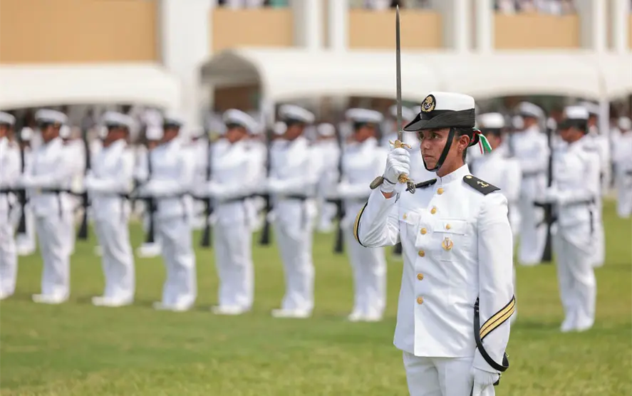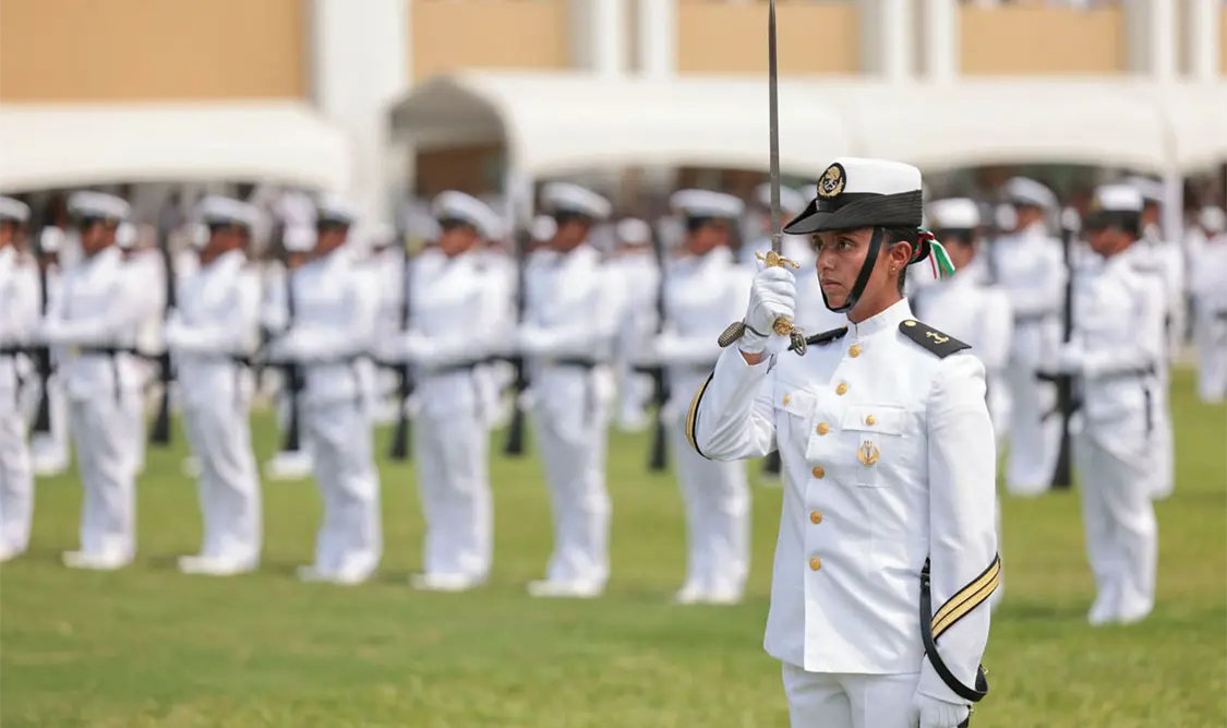 “Finalmente, no por ello menos importante, tenemos el gran honor y privilegio de apoyar a nuestra población en casos de necesidades públicas, así como construir, contribuir al desarrollo nacional con una visión de prosperidad compartida”, aseveró Morales Ángeles ante cientos de cadetes y familias en la explanada de la Heroica Escuela Naval Militar.