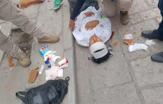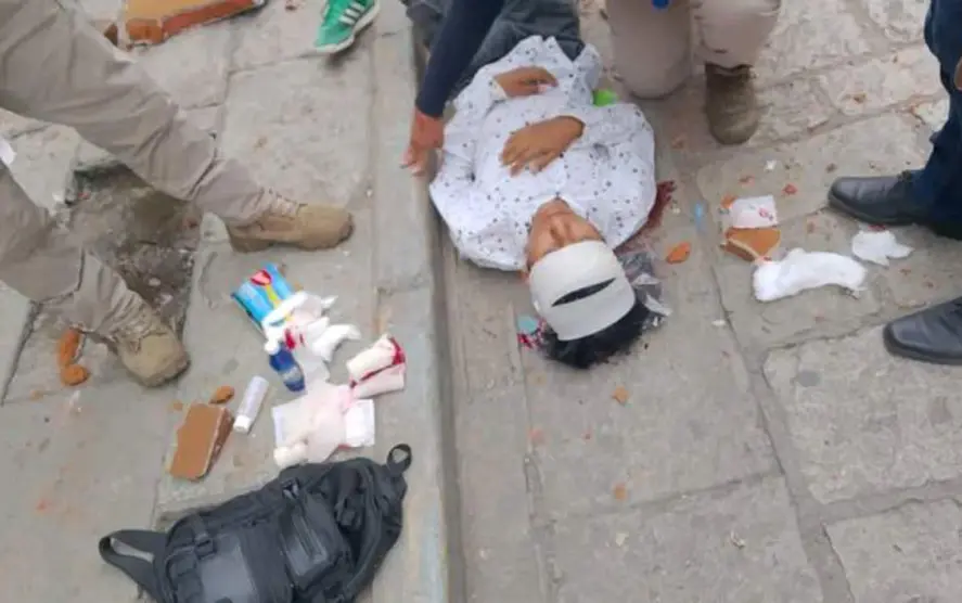De acuerdo con el saldo preliminar en la calle Macedonio Alcalá del Centro Histórico de la ciudad, Isaac López Hernández de 16 años recibió un golpe en la cabeza tras la caída de un pedazo de cantera, quien fue trasladado al Hospital General Doctor Aurelio Valdivieso por personal paramédico de la Cruz Roja, a bordo de la unidad 043 en código rojo.