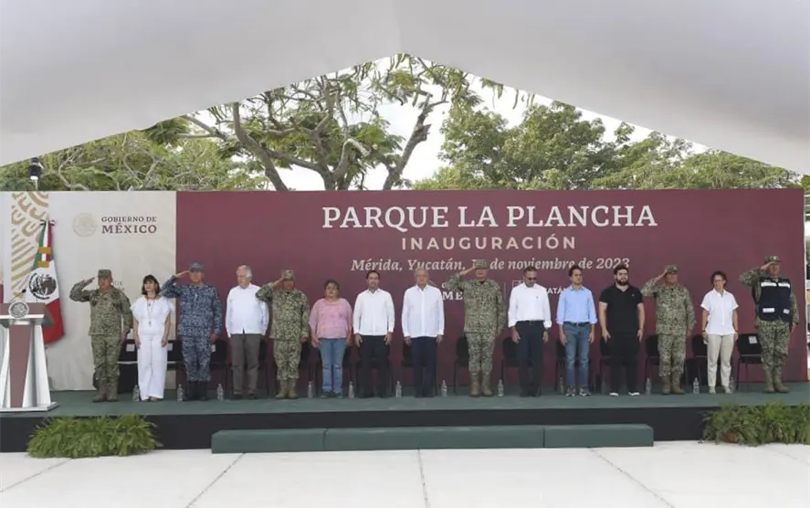Al inaugurar el “Gran Parque de la Plancha”, de Mérida, Yucatán, López Obrador destacó que en muy poco tiempo esta división castrense construyó obras de calidad a precios muy bajos.