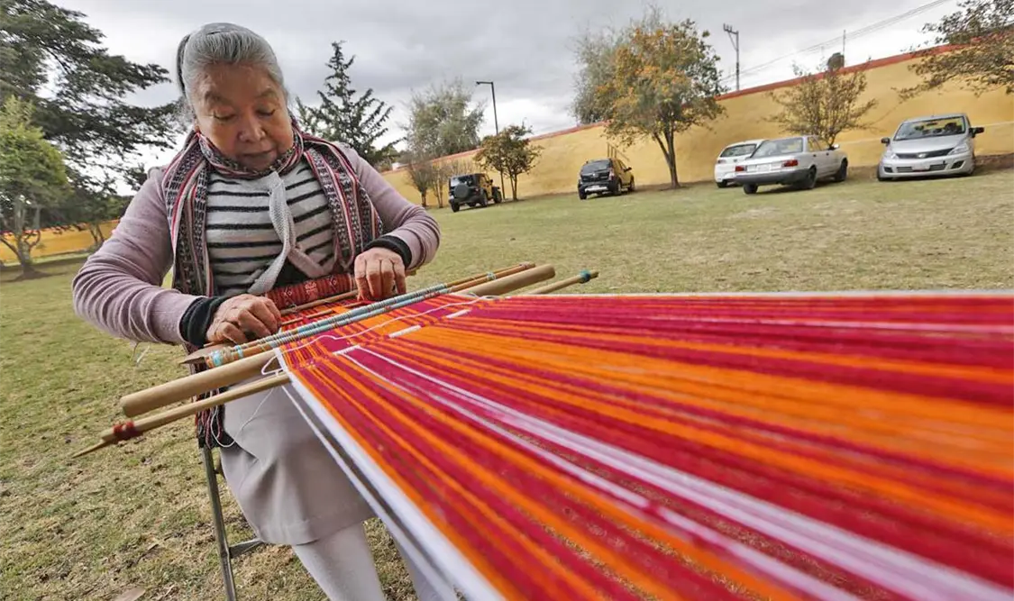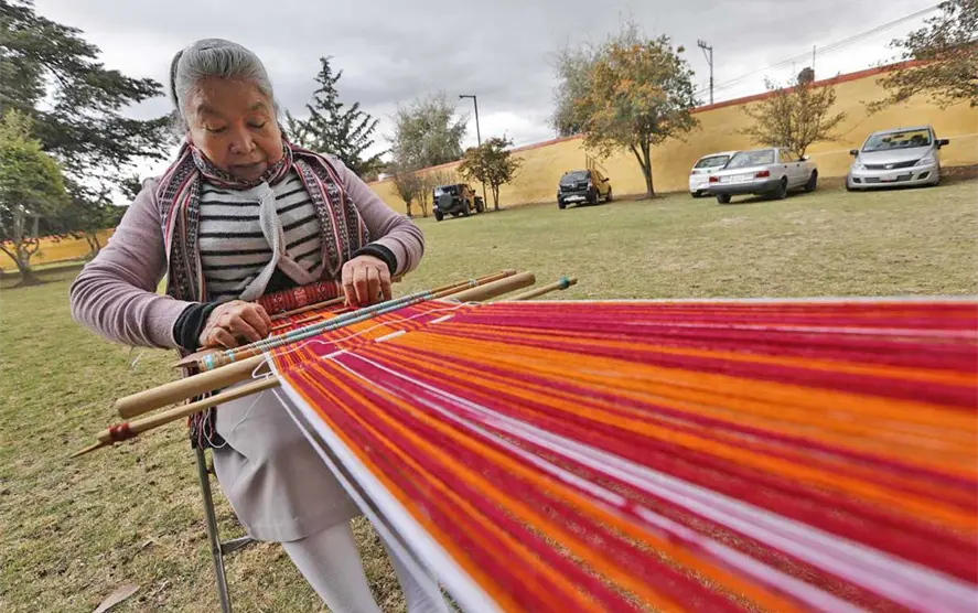 Sus piezas son únicas: los rebozos, los quexquémetl, los chincuetes y las fajas que elabora en el telar a mano con motivos emblemáticos de la cosmovisión otomí.