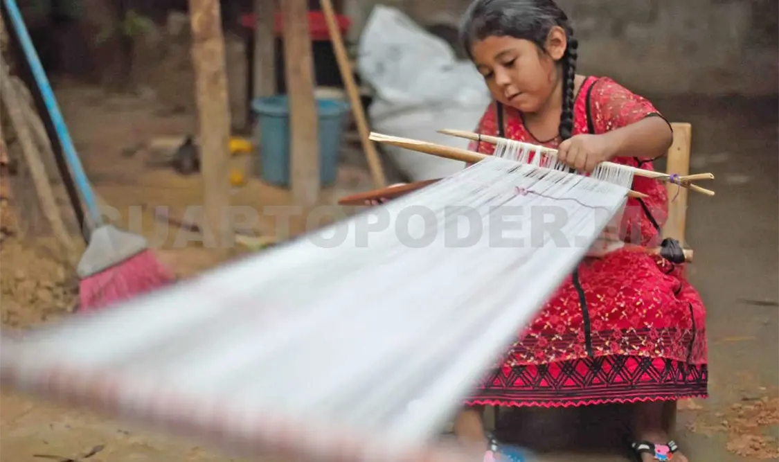 Evelyn comparte que lo que más le gusta de formar el lienzo son las flores y le gusta combinar colores. La niña se amarra su telar de 30 centímetros de ancho a la cintura y con un palo, llamado machete, que coloca en medio de la selección de hilos previamente alineados, va “machucando”, “apretando”, para que su blusa quede bonita y bien formada. Dice que puede pasar sentada hasta tres horas.