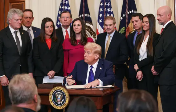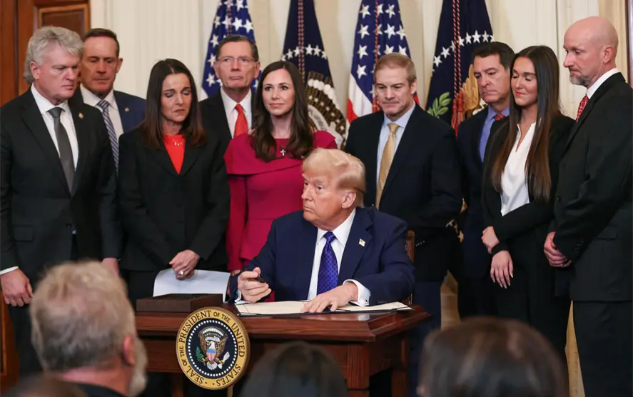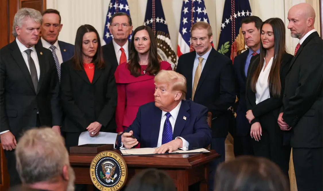 Durante el acto de promulgación de la ley, el mandatario estadounidense destacó el trabajo de varios integrantes de su equipo, especialmente de la secretaria de Seguridad Nacional, Cristi Noem, a quien calificó como una persona dura.
