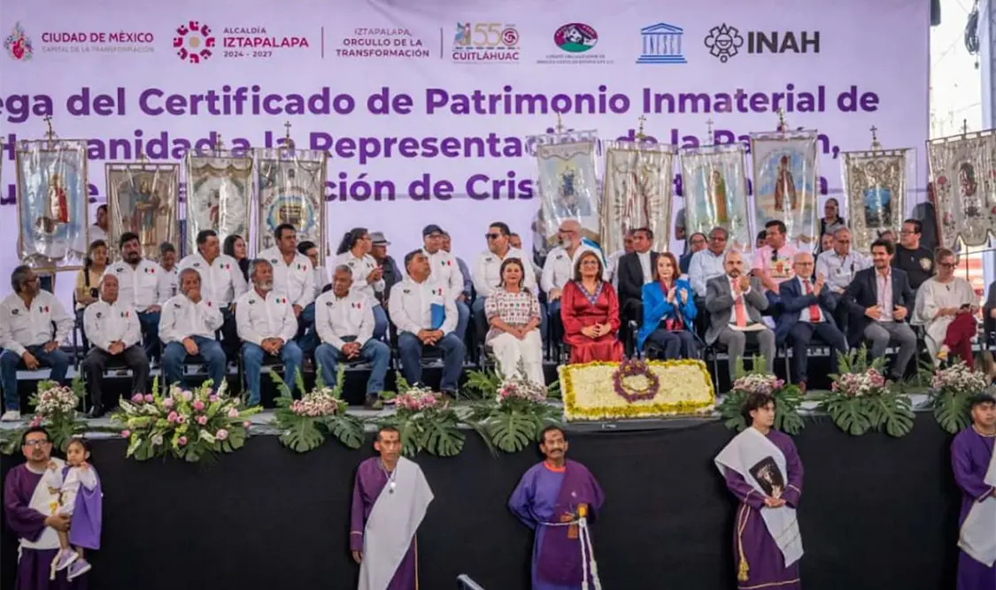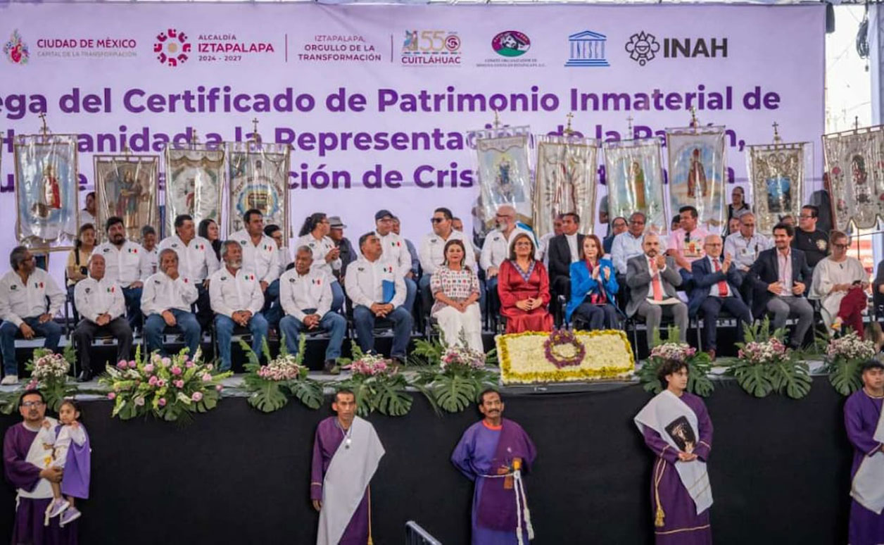 La jefa de gobierno de la Ciudad de México (CDMX), Clara Brugada, junto a la alcaldesa de Iztapalapa, Aleida Alavez, encabezaron la entrega del Certificado que reconoce a la Pasión, Muerte y Resurrección de Cristo de Iztapalapa, como Patrimonio Inmaterial de la Humanidad por parte de la Organización de las Naciones Unidas para la Educación, la Ciencia y la Cultura (Unesco).