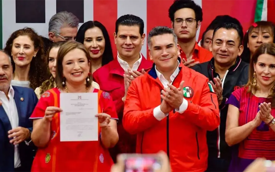 Flanqueada por Alejandro Moreno Cárdenas, líder del PRI, Carolina Viggiano, y otros legisladores, Gálvez se dijo convencida de derrotar al oficialismo y a su candidata Claudia Sheinbaum.