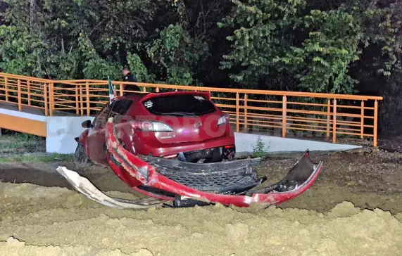 En la ciudad de Palenque los pasajeros de un automóvil Mazda 3 de color rojo, presuntamente ebrios, terminaron su temeraria carrera al impactarse contra la rampa del puente peatonal ubicado a la altura de la estación del Tren Maya, sobre la calzada Lázaro Cárdenas, en las últimas horas de la noche del sábado.