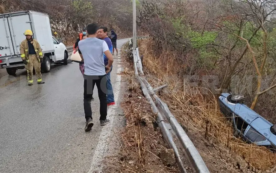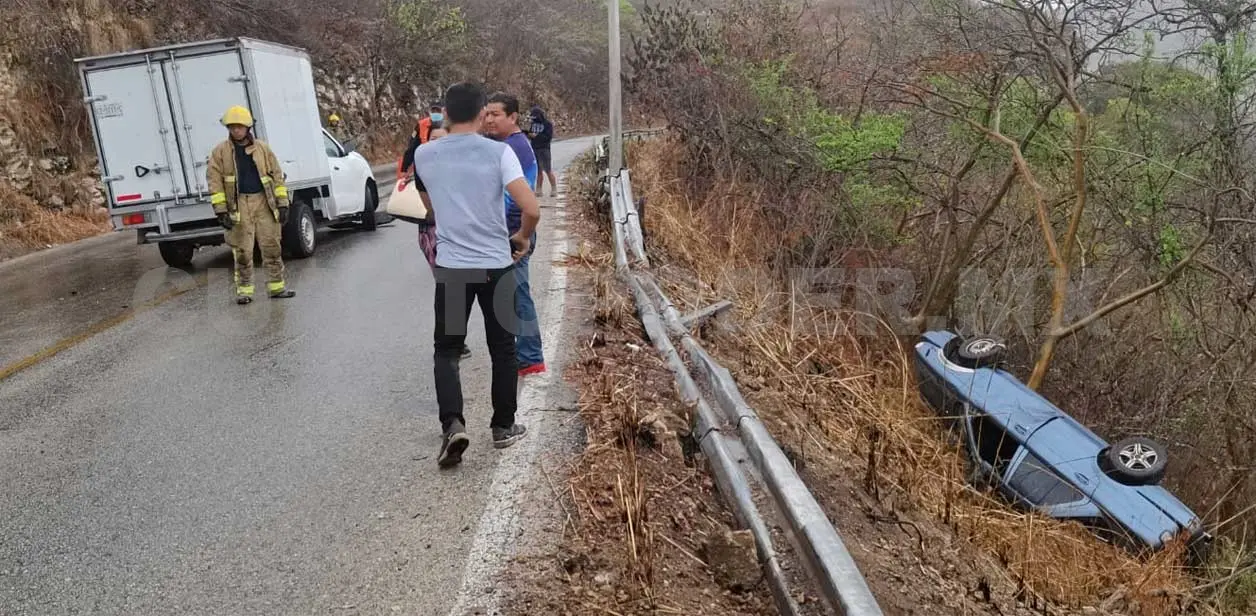 Según elementos policiacos, a las 09:30 horas un vehículo Nissan tipo Tsuru, con placas de circulación DSF-4102, que era manejado por Layres Eduardo “N”, quien no pudo controlar la unidad y el asfalto mojado, provocó que volcara y acabara en un barranco, aunque por fortuna salió ileso.