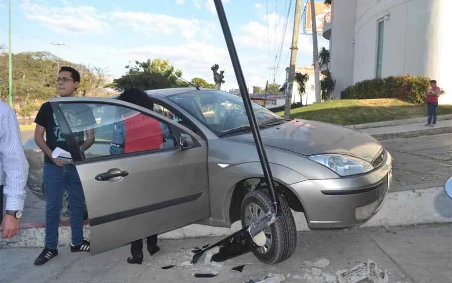 El transportista impactó por alcance al sedán, lo que provocó que el conductor del particular perdiera el control y subiera a la guarnición del estacionamiento de un local y derribara el poste de un anuncio publicitario.