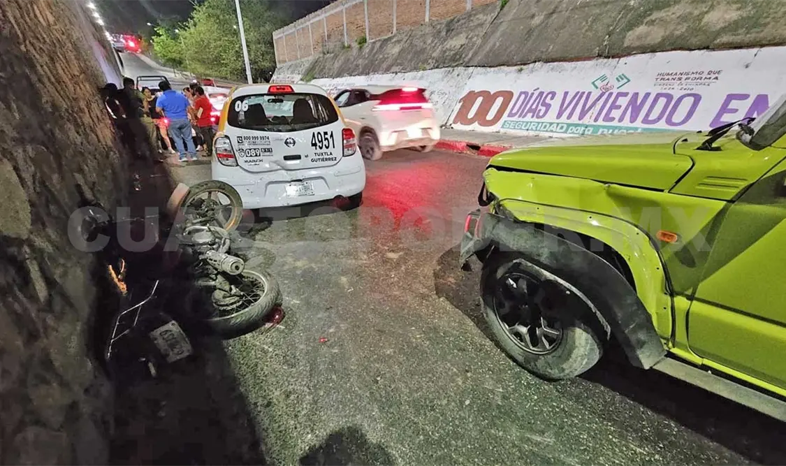 Un motociclista resultó con diversas heridas luego de estar involucrado en un accidente de tránsito sobre el libramiento Norte, a la altura de la 5.ª calle Poniente, en la capital Tuxtla Gutiérrez. El percance involucró a tres vehículos: una camioneta particular, un taxi y una motocicleta.