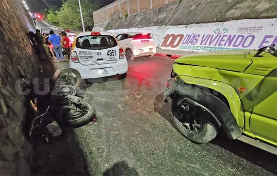 Antes de llegar a la intersección con la 5.ª Poniente, el conductor de una camioneta particular se estrelló por alcance contra el motorista que fue proyectado en la parte trasera de un taxi con número económico 4951.