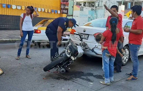 Prensados entre dos vehículos quedaron dos motociclistas que resultaron lesionados y su estado de salud se reporta como grave, al ser trasladados al hospital regional de Tapachula.