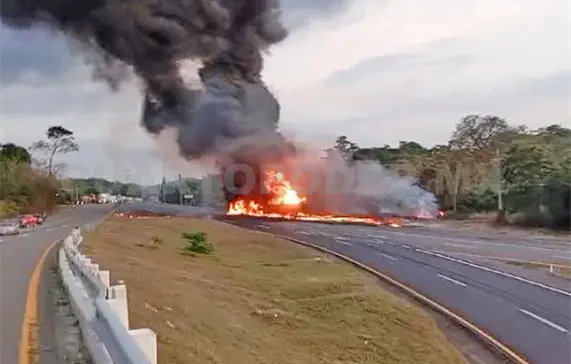 Un incendio de gran magnitud se registró en la denominada Curva del Diablo, tras la volcadura de un tráiler que jalaba dos pipas cargadas de combustible, sin que hasta el momento se haya establecido si el conductor logró salir.
