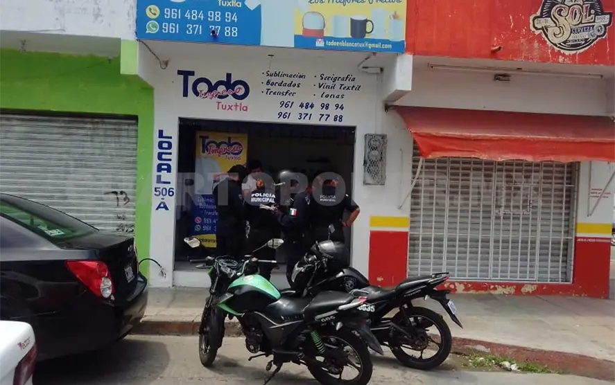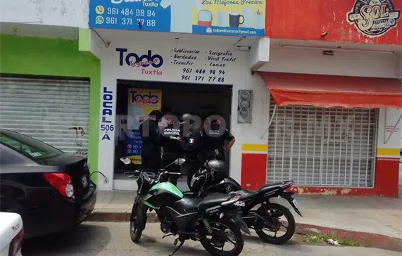 Efectivos motorizados estatales y municipales arribaron al inmueble con rótulos Todo Impreso, marcado con número exterior 506-A, donde minutos antes se había perpetrado un atraco.