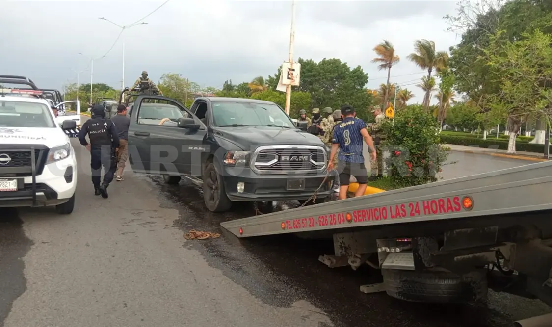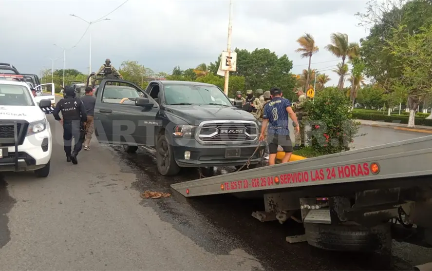 En las inmediaciones del Teatro de la Ciudad fue interceptado un vehículo Dodge RAM de color gris oscuro, cuyo conductor al ver la presencia policiaca intentó darse a la fuga.