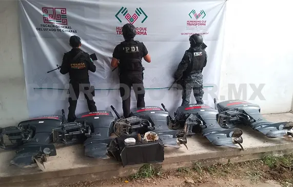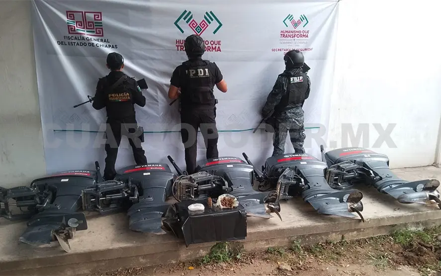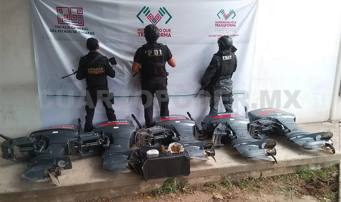 Además se aseguraron cinco lanchas y un lanchón; cinco motores fuera de borda de la marca Yamaha, productos químicos presuntamente utilizados para elaboración de drogas sintéticas, tres bolsas de nylon con droga cristal, marihuana.
