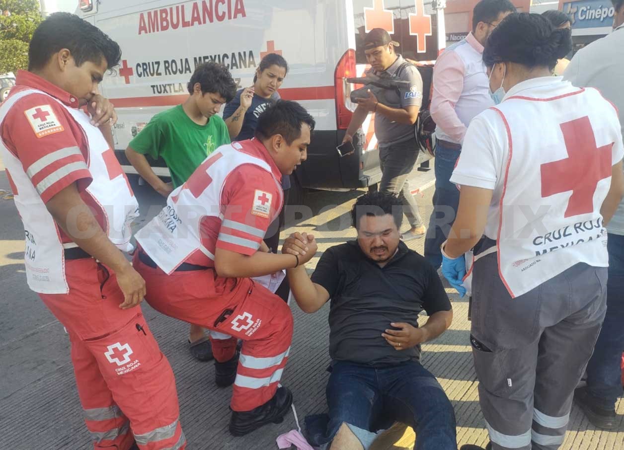 Con múltiples lesiones en sus extremidades terminó un joven motociclista luego de ser impactado por un vehículo particular sobre la 5.ª avenida Norte, justo frente a “Plaza Sol” (Las Américas), en la zona norte-poniente de Tuxtla Gutiérrez.
