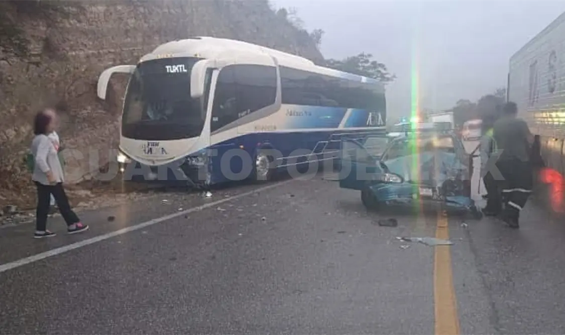 Minutos antes de las 18:00 horas alertaron a las corporaciones de auxilio sobre una colisión entre un autobús de pasajeros con un auto tipo Chevy, dejando, hasta ese momento, varias personas lesionadas.