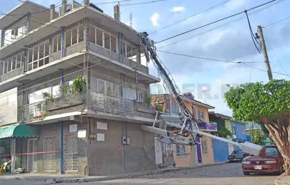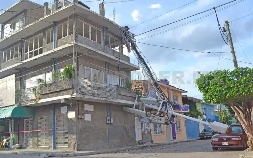 Una gigantesca antena de telefonía celular cayó desde lo alto de una casa de tres pisos, en la colonia Bienestar Social, en la capital chiapaneca. Además del daño provocado a la vivienda sobre la que estaba colocada, la estructura metálica cayó sobre un auto estacionado. El conductor acababa de bajar.