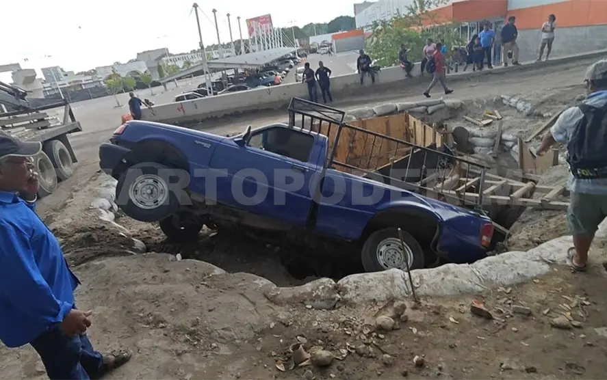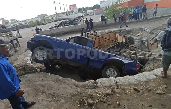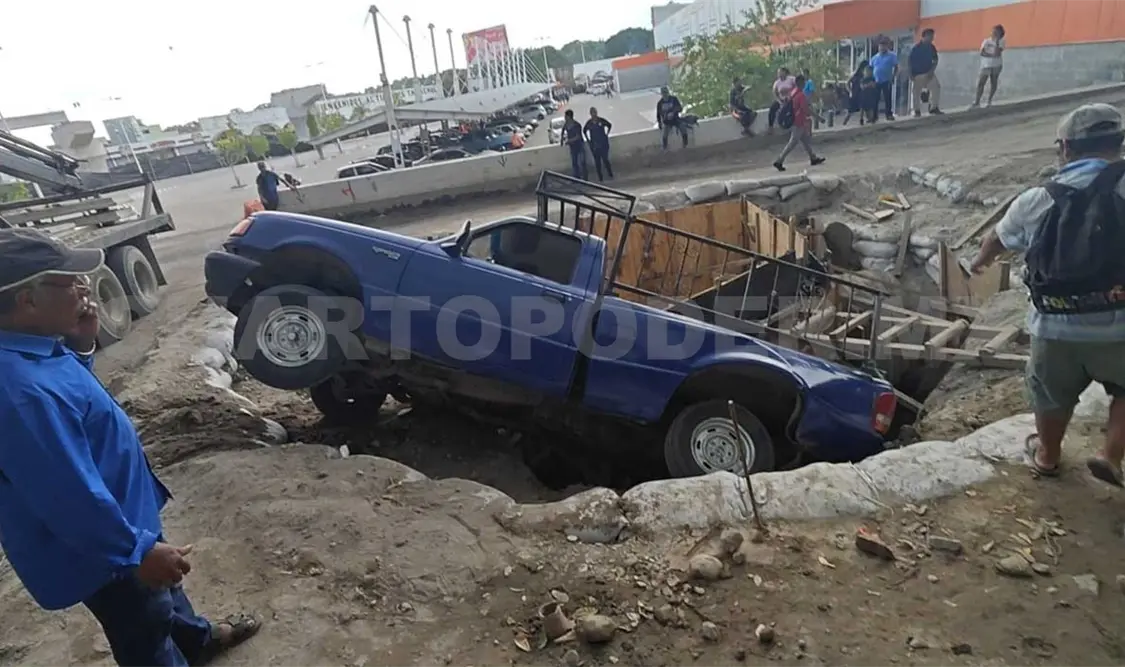 Por causas que hasta el momento se desconocen, el conductor de una camioneta ingresó a la zona en donde se construye el puente elevado San Juan en el municipio de Tapachula, cayendo en uno de los hoyos de un pilote.