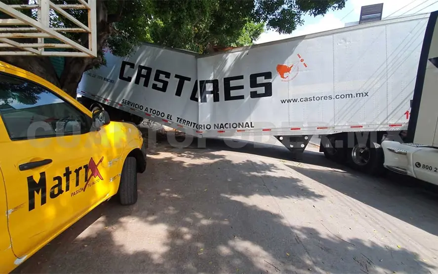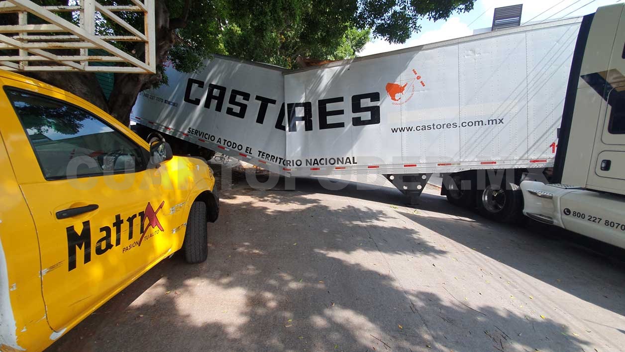 Se informó que un tráiler estaba echándose de reversa para ingresar a la bodega de una empresa de autopartes, sin embargo, justo al subir a la rampa acabó la pesada unidad partida por la mitad.