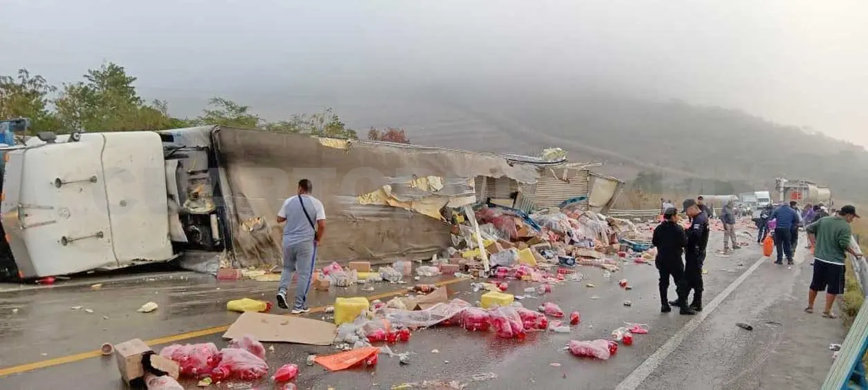 Un camión que transportaba mercancía para las tiendas de abarrotes acabó volcado sobre el camino que conecta a Ocozocoautla con Tuxtla Gutiérrez, a la altura del libramiento coiteco, luego de perder el control e impactarse contra una pipa de doble remolque y dañar a una camioneta.