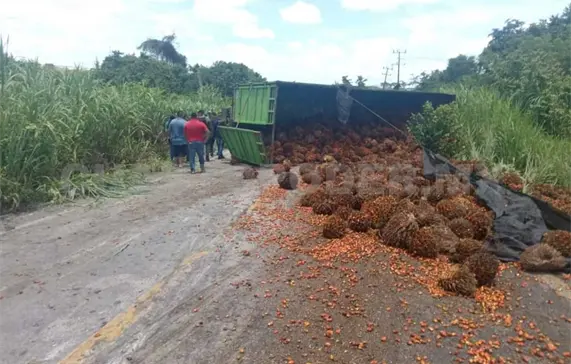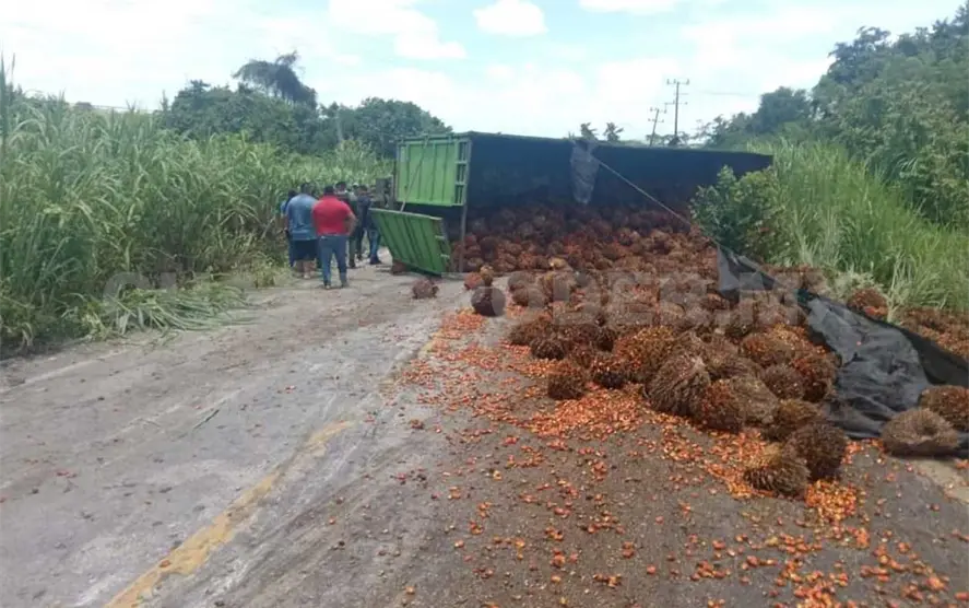 Un camión de gran tamaño, cargado con palma de aceite, tuvo una volcadura justo en el tramo de la colonia El Porvenir.