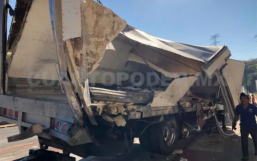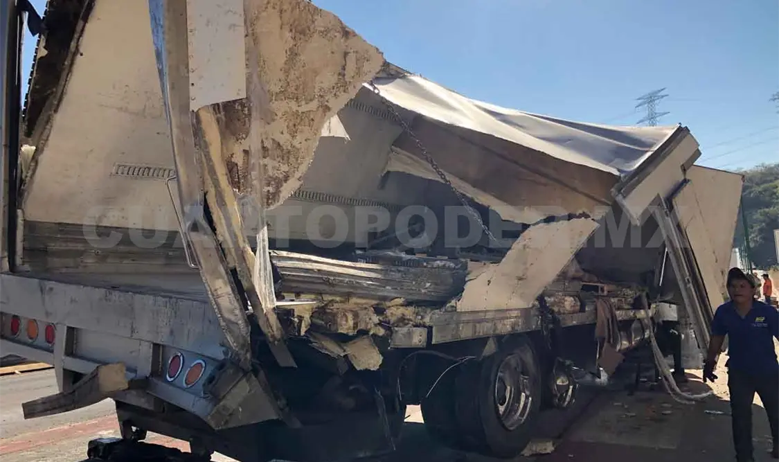 De acuerdo con los acompañantes del conductor, el tractocamión golpeó con el último señalamiento que alerta sobre la rampa de frenado, por lo que la caja refrigerada de carga se impactó con el cerro que se ubica en el costado de la vía de ingreso.